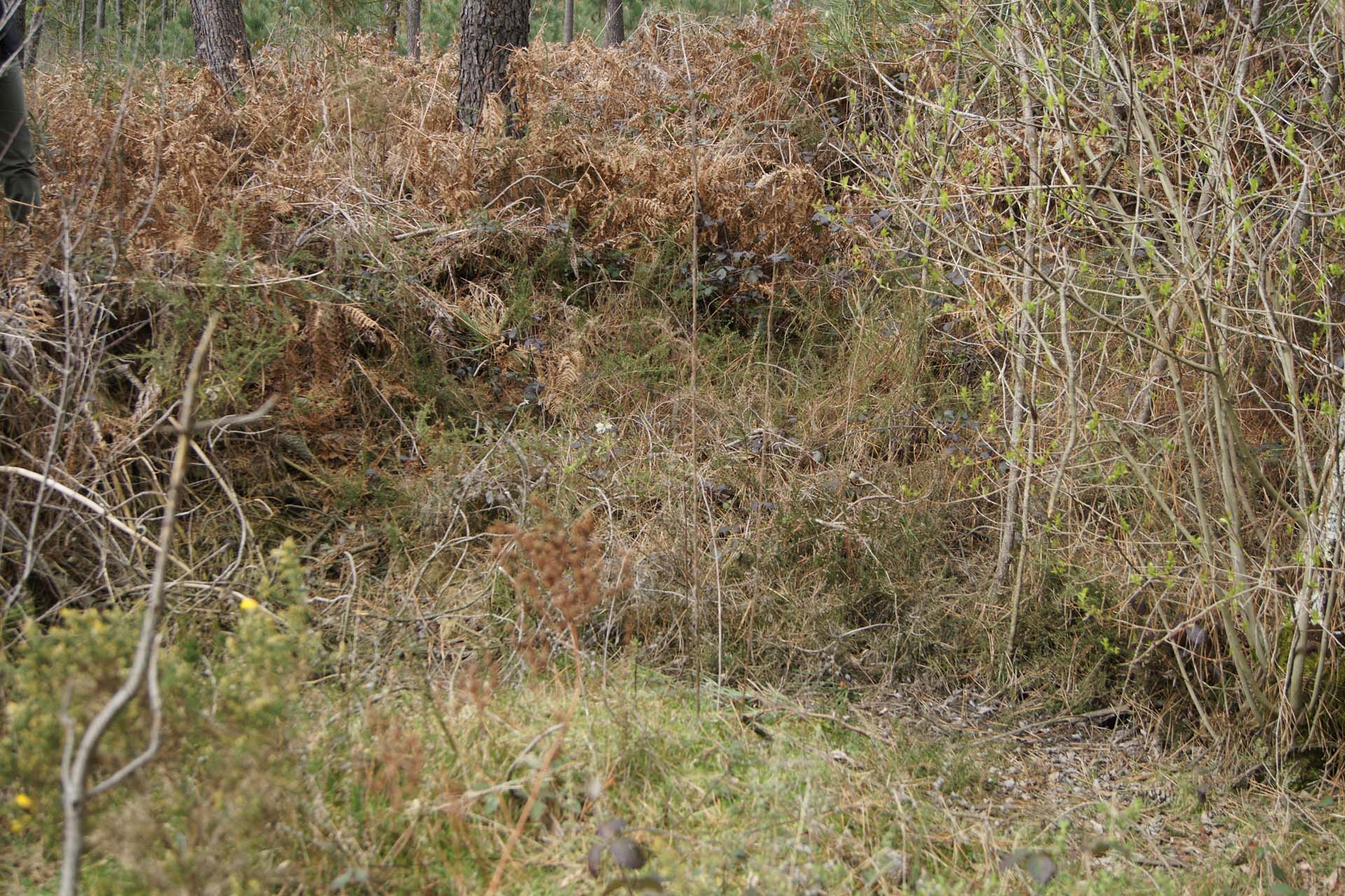 Na parte centro-norte do túmulo hai outra depresión de menor tamaño que “enlaza” coa antes citada. Nalgunhas zonas, debido a alteracións producidas por animais, pódense ver restos da terra que conforma a masa tumular (moi fina e de cor avermellada) así como pedras dunha coiraza.