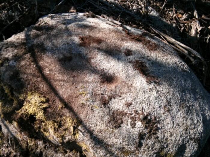 Combinación circular nunha rocha ao pé do Castro de Negros. Unha pedra que levanta 60 cm. do chan cunha cazoleta enmarcada por un círculo de 20 cm. de diámetro.